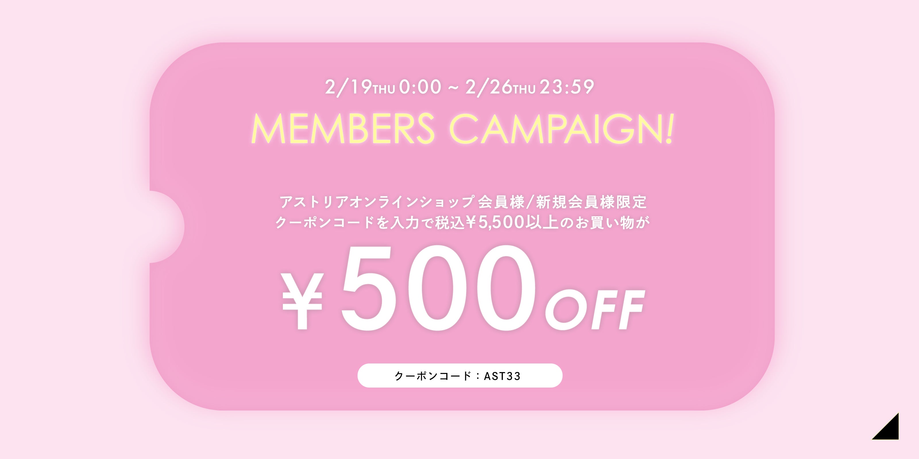 ◼︎アストリアオンラインショップ限定◼︎ メンバーズキャンペーン♪ 会員様限定で「500円off」クーポンプレゼント✨ ◼︎開催期間◼︎ 2026年 2月19日(木)0:00 ~ 2月26日(木)23:59 対象商品を(税込)5,500円以上お買い上げ&クーポンご利用で「500円off」に♪ 新規のお客様も、会員登録でその日のお買い物からご利用可能です! ◼︎対象商品◼︎・新作...